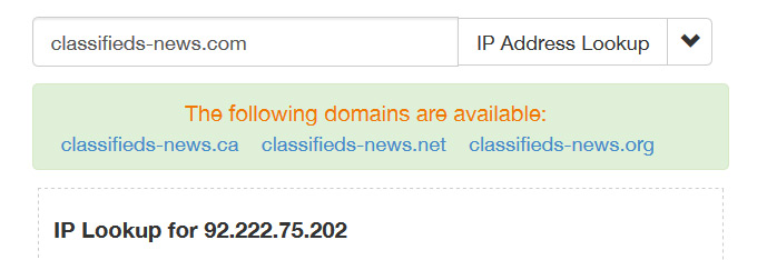 Because of those unusual details, I started looking into the content of the messages a little more closely. All of the Kijiji-spoofing spam contained links to spammy-looking domain names with uncommon TLDs like ".trade", ".loan", and ".bid", etc - and invariably, the links have all redirected to the website http://classifieds-news[dot]com (to avoid giving the spammers any kind of SEO-boost, we decided not to link to the site directly or publish it's domain without obfuscating it). The first surprise was that both the redirect links, and the site that they redirected to, were also hosted by OVH: the classifieds-news[dot]com domain name resolves to the IP address 92.222.75.202 - which according to lookup/geolocation services, is located in France and owned by the provider "Ovh Sas."