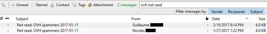 As you may have already guessed, OVH ended up on my radar in May of 2015 when I started noticing a large volume of spam originating from their servers. These appeared to be different from a normal spam run, however, because the messages were almost all identical (spoofed/fake Kijiji alerts), and were being repeatedly sent to the same small number of EMail addresses. That approach is much more risky for the spammer, because it makes it much easier for their hosting provider to detect the spamming and shut down their account. In contrast, most spam are done in more of a fly-by-night fashion, where the spammers will try to send as many different spam EMails to as many different EMail addresses, in as short a time as possible - to get as much return on their "spamming investment" as possible before being shut down by their hosting provider. In fact, the behaviour of these spammers operating on the OVH network much more closely resembled that of spammers operating on "bulletproof" hosting providers, which refers to hosts that will not shut off customers, no matter how many abuse complaints they receive. Spammers using those types of providers typically take less precautions to hide their activities from their hosting provider, because they have reason to believe the hosting provider will turn a blind eye to the complaints.