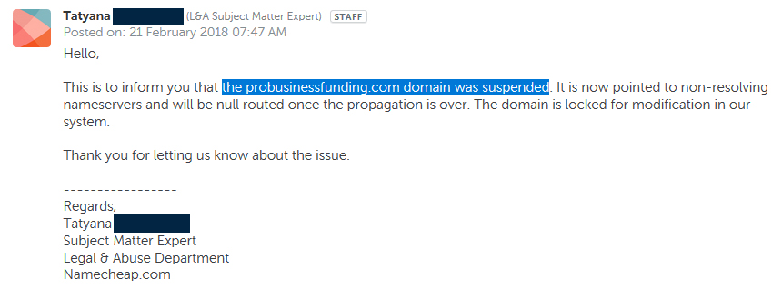 The one kinda-sorta exception was PROBUSINESSFUNDING.COM: initially they claimed that they had resolved the problem by suspsending the domain's registration: