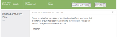 It also turned that this was not an isolated issue - or a new one either. A recent article published by Brian Krebs, one of the comments linked to blog post from 2015, which details almost the exact same issue: same spammer tactic (using domains hosted by/registered with Namecheap to embed content from separate stes via frames/masked redirects), and the exact same run-around from Namecheap's support staff (repeatedly claiming that the spam sites weren't hosted by them, when they clearly were) - the only difference seems to be that those spammers were hawking weight lose products instead of business loans. So that issue has been ongoing for at least 3 years now, and Namecheap is well-aware of it. While the KrebsOnSecurity article wasn't about that particular issue, it did mention NameCheap as one of the top registrars for TLDs (domain name extensions) that are favoured by spammers and spammers; the article also includes a quote from Namecheap's CEO, Richard Kirkendall, where (among other things) he accuses Krebs - a noted tech security ressearcher/journalist - of making "irresponsible assumptions." Kirkendall (or at least someone claiming to be him) then jumped into the article's comments, and didn't exactly inspire confidence in the company's willingness to address spam issues - particularly when he referred to people who oppose spamming as "nazis."